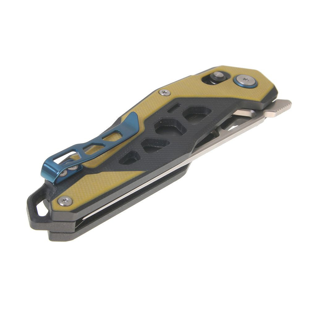 Ostrze wykonane ze stali D2 (HRC 59–61) gwarantuje długotrwałą ostrość i niezawodną wydajność nawet w trudnych warunkach. Teksturowane okładziny z G10 zapewniają pewny, antypoślizgowy chwyt w każdej sytuacji. Dzięki innowacyjnemu systemowi otwierania front fin, ostrze można szybko i dyskretnie otworzyć jedną ręką. Blokada Ambi-Lock (crossbar lock) gwarantuje bezpieczne i płynne działanie – zarówno dla osób prawo-, jak i leworęcznych.